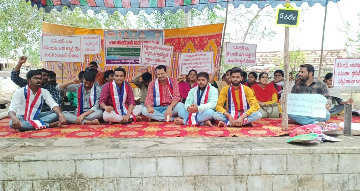 ముస్తాబాద్ ప్రతినిధి వెంకటరెడ్డి మే 2, బిసి విద్యార్థి సంఘం సిరిసిల్ల డివిజన్ ఇంచార్జీ ఇల్లందుల ప్రకాష్ అధ్వర్యంలో తంగల్లపల్లి మండల కేంద్రంలో శాంతియుతంగా సమ్మె చేస్తున్న జూనియర్ పంచాయితీలను బిసి విద్యార్థి సంఘం రాష్ట్ర కోఆర్డినేటర్ కంచర్ల రవి గౌడ్ సంఘీభావం తెలియజేశారు. అనంతరం రవి గౌడ్ మాట్లాడుతూ జూనియర్ పంచాయితీ కార్యదర్శులను వెంటనే పర్మెంట్ చేస్తూ 4, సంవత్సరాల ప్రోబిషన్ పీరియడ్ ను రెగ్యులర్ చేయాలని రాష్ట్ర ప్రభుత్వాన్ని డిమాండ్ చేశారు. తెలంగాణ రాష్ట్రంకి కేంద్ర ప్రభుత్వం నుండి వస్తున్న ఉత్తమ గ్రామ పంచాయితీ అవార్డ్ లకి కారణం ఎవరు అని ప్రశ్నించారు. రాత్రి పగలు, ఎండ వాన అనక విధులు నిర్వర్తించే ఇలా సమ్మె లు చేపించడం తగదు అని అన్నారు. ఒక్క గ్రామం డెవలపమెంట్ కి పంచాయితీ కార్యదర్శి కీలక పాత్ర అని గుర్తు చేశారు. వీళ్ళు చేసే శాంతియుత సమ్మేకి బిసి విద్యార్థి సంఘం రాష్ట్ర కమిటీ పక్షాన పూర్తి మద్దతు వుంటుంది అని అన్నారు.ఇప్పటికైనా ప్రభుత్వం వెంటనే జూనియర్ పంచాయితి కార్యదర్శిలను వెంటనే 4, సంవస్సరాల పీరియడ్ ను కలుపుకొని పరిమినెంట్ చెయ్యాలని అని డిమాండ్ చేశారు. ఈ కార్యక్రమంలో బీసీ విద్యార్థి సంఘం సిరిసిల్ల డివిజన్ ఇంచార్జీ ఇల్లందుల ప్రకాష్, సిరిసిల్ల మండల అధ్యక్షులు మట్టే నరేష్,నాయకులు పోతర్ల వంశీ, పోతర్లా గణేష్, సాయి, నవీన్,రాజు లు పాల్గొన్నారు.