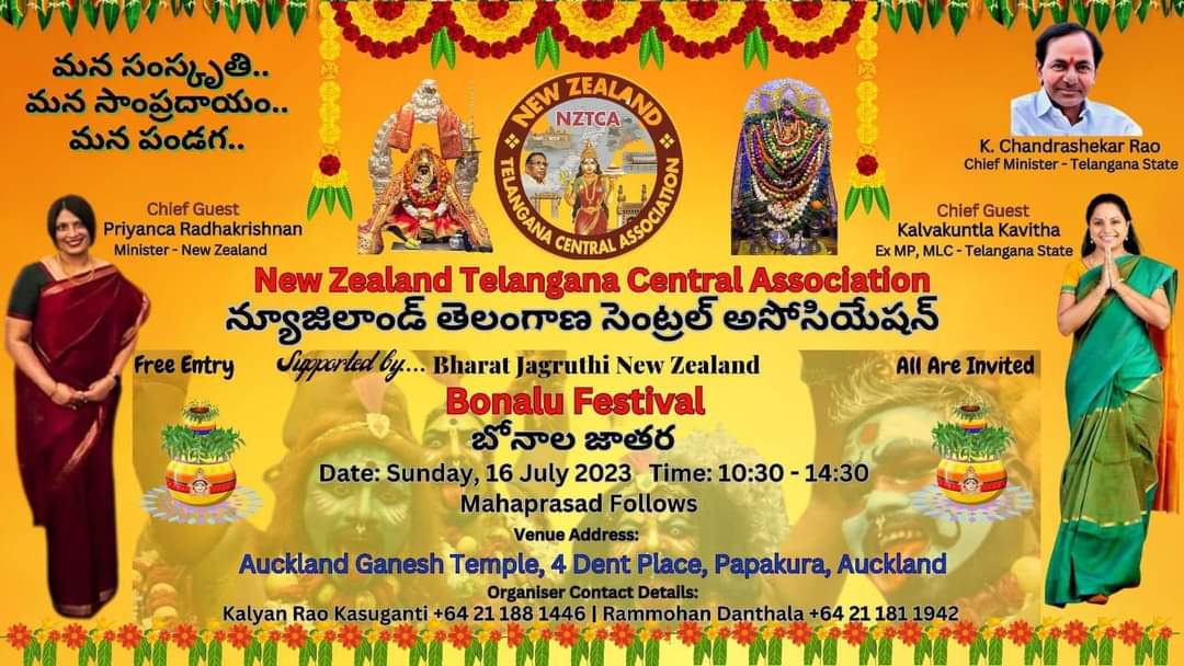 అలాగే జులై 16న న్యూజిలాండ్లోని ఆక్లాండ్ నగరంలో జరగనున్న బోనాల వేడుకలో ఎమ్మెల్సీ కవిత పాల్గొంటారు. న్యూజిలాండ్ తెలంగాణ సెంట్రల్ అసోసియేషన్ ఆధ్వర్యంలో జరగనున్న ఈ బోనాలు వేడుకలకు ఏర్పాట్లు జరుగుతున్నాయి. ఆక్లాండ్ లోని గణేష్ టెంపుల్ లో ఉదయం 11 గంటలకు ఈ కార్యక్రమం జరిగింది.