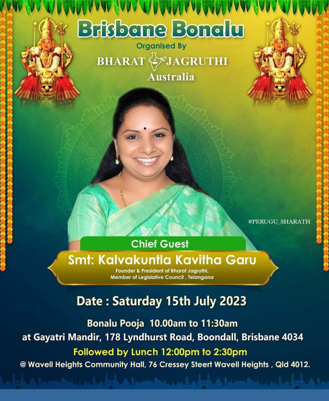 ఆస్ట్రేలియా, న్యూజిలాండ్లలో జరగనున్న బోనాలు పండుగలో ఎమ్మెల్సీ కల్వకుంట్ల కవిత పాల్గొననున్నారు. ఏప్రిల్ 15న ఆస్ట్రేలియాలోని బ్రిస్ బెన్ నగరంలో “భారత జాగృతి ఆస్ట్రేలియా” ఆధ్వర్యంలో బోనాలు సంబరాలు జరుగుతున్నాయి. ఉదయం 10 గంటలకు బ్రిస్ బేన్ లోని గాయత్రి మందిరంలో జరగనున్న ఈ వేడుకలకు ప్రవాస భారతీయులతోపాటు ఆస్ట్రేలియా మంత్రులు, ఎంపీలు హాజరుకానున్నారు.