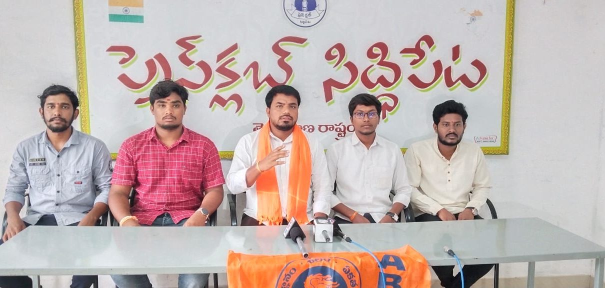 స్థానిక సిద్దిపేట జిల్లా కేంద్రంలో ఉన్న ప్రెస్ క్లబ్ లో ఏబీవీపీ మీడియా సమావేశం నిర్వహించడం జరిగింది ఈ సమావేశాన్ని ఉద్దేశించి ఏబీవీపీ రాష్ట్ర సంయుక్త కార్యదర్శి కమల్ సురేష్ మాట్లాడుతూ” అమరుల త్యాగాల పునాదుల మీద ఏర్పడ్డ తెలంగాణ రాష్ట్రం నేడు అమరుల ఆశయాలకు తూట్లు పొడిచే విధంగా రాష్ట్రంలో పాలన కొనసాగుతుంది మరి ముఖ్యంగా విద్యారంగం విధ్వంసం కాబడింది. నిరుద్యోగుల ఆశలు అడియాశలు అయ్యి రోడ్డు పాలు అవుతున్న సందర్భం ఏర్పడింది. నేడు రాష్ట్రంలో ప్రభుత్వ పాఠశాలలు కళాశాలలో బోధన బోధనేతర ఖాళీలను వెంటనే భర్తీ చేయాలి. అదేవిధంగా మౌలిక వసతులు లేక సాక్షాత్తు సీఎం గారి మనవడే మొన్న సీఎం గారి పాలనను బట్టబయలు చేయడం జరిగింది. పేద విద్యార్థులను విద్యకు దూరం చేసే విధంగా ఈ రాష్ట్ర ప్రభుత్వం కుట్ర పన్నుతూ 8624 ప్రభుత్వ పాఠశాలను మూసివేయడం జరిగింది. కాబట్టి వాటిని వెంటనే ప్రారంభించి ప్రైవేట్ కార్పొరేట్ పాఠశాలలో ఫీజు నియంత్ర చట్టం చేసి ఫీజుల దోపిడిని అరికట్టాలి. అదేవిధంగా పెండింగ్లో ఉన్న స్కాలర్షిప్ ఫీజు రియంబర్స్మెంట్ 5,300 కోట్ల బకాయిలను వెంటనే విడుదల చేయాలి. సంక్షేమ వసతి గృహాలకు పక్కాభవనాలు కట్టించి మెరుగైన వసతులు కల్పించాలి. యూనివర్సిటీలలో ఖాళీగా ఉన్న టీచింగ్ నాన్ టీచింగ్ పోస్టులను భర్తీ చేయాలి అలాగే రాష్ట్రంలో ఖాళీగా ఉన్న 1.91 లక్షల ప్రభుత్వ ఉద్యోగాలను భర్తీ చేసి టీఎస్పీఎస్సీ ప్రక్షాళన చేసి పటిష్టం చేయాలి. రాష్ట్రంలో ఏరులై పారుతున్న మద్యం, మహిళలపై జరుగుతున్న దాడులను అరికట్టాలి. రైతు రుణాలను తక్షణమే మాఫీ చేసి, కల్తీ విత్తనాలు నిరోధించాలి. కాబట్టి పై డిమాండ్ సాధనకై మార్పు కోసం మహా ఉద్యమంలో భాగంగా ఆగస్టు ఒకటిన చలో హైదరాబాద్ పరేడ్ గ్రౌండ్లో *కదన బేరి* పేరుతో భారీ బహిరంగ సభ నిర్వహించడం జరుగుతోంది కావున విద్యార్థులు నిరుద్యోగులు, కళాకారులు కార్మికులు, మేధావులు అందరూ పాల్గొని విజయవంతం చేయాల్సిందిగా ఏబీవీపీ కొరుతుంది.ఈ