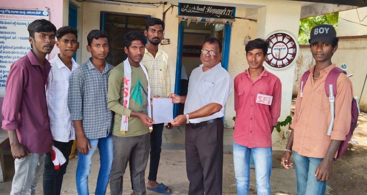 చేర్యాల:భరత విద్యార్థి ఫెడరేషన్ ఎస్ఎఫ్ఐ చేర్యాల మండల కమిటీ ఆధ్వర్యంలో రూట్ ఎంక్వయిరీ గారికి వినతి పత్రం అందించడం జరిగింది దాని అంతరం ఎస్ఎఫ్ఐ చేర్యాల మండల కార్యదర్శి నాగపురి కిరణ్ మాట్లాడుతూ కరోనా కాలం ముందు శభాష్ గూడెం గ్రామానికి బస్సు సౌకర్యం ఉండేదని కరోనా తర్వాత శభాష్ గూడెం కు కూడా గ్రామానికి బస్సు రాకపోవడం వల్ల విద్యార్థులు మరియు ప్రజలు తీవ్రంగా ఇబ్బంది గురవుతున్నారని వారు తెలిపారు ఎస్ఎఫ్ఐ ఆధ్వర్యంలో నాగపురి గ్రామంలో ధర్నా చేసిన అప్పటి మందము విద్యార్థులను బస్సు సౌకర్యం కల్పిస్తామని తేనె పలుకులు పలికించి ధర్నా చేస్తున్న విద్యార్థులను మభ్యపెట్టి వారిని ధర్నా విరమించేలాగా హామీలు చెప్పి ఇప్పటివరకు కల్పించక కల్పించకపోవడంతో నేడు జనగామ రూట్ ఎంక్వయిరీ గారికి వినతి పత్రం అందించడం జరిగింది రానున్న కాలంలో తీవ్రమైన పరిణామాలు ఎదుర్కోవాల్సి వస్తుందని వారు తెలిపారు ఇప్పటికైనా బస్సు సౌకర్యం కల్పించాలని విజ్ఞప్తి చేశారు డిపో మేనేజర్ గారు ఇచ్చిన మాటపై నిలబడలేదని వారు తెలిపారు బస్సు సౌకర్యం కల్పించాలని వారు తెలిపారు ఈ కార్యక్రమంలో అనిల్ కార్తీక్ భరత్ సాయి కృష్ణ భాస్కర్ మధు బాపురాజ్ అఖిల్ సామి తదితరులు పాల్గొన్నారు