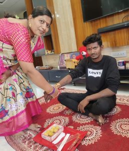 ఎల్లారెడ్డిపేట.అనాధగా ఉన్న ఓ తమ్మునికి అక్క అయ్యింది. రాఖీ కట్టింది. ఎల్లారెడ్డిపేట మండలం రాచర్ల గొల్లపల్లి గ్రామ పంచాయితీ పారిశుద్ధ కార్మికులుగా పనిచేస్తున్న తల్లి దండ్రులు లేని అనాధ అని తెలుసుకొని గురువారం కొండ రేణుక రమేష్ దంపతులు తమ స్వగృహానికి పిలిపించుకొని రాఖీ కట్టి మిఠాయి తినిపించి సోదర భావం వ్యక్తపరిచి తన ఔదార్యాన్ని చాటుకుంది. ఈ సందర్భంగా కొండ రేణుక మాట్లాడుతూ రాఖీ కట్టడానికి రక్త సంబంధం అవసరం లేదని తల్లిదండ్రులు లేని ఆ కార్మికునికి ఓ అక్కగా రాఖీ కట్టానని తన సంతోషాన్ని వ్యక్తపరిచింది.