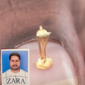 రాజన్న సిరిసిల్ల జిల్లా ఎల్లారెడ్డిపేట మండల కేంద్రానికి చెందిన యువ స్వర్ణకారుడు సూక్ష్మ బంగారు వరల్డ్ కప్ ను తయారు చేశాడు. శనివారం మండల కేంద్రానికి చెందిన శ్రీగాద సంతోష్ అనే స్వర్ణకారుడు వరల్డ్ కప్ టోర్నీలో భారత్ టీమిండియా ఆస్ట్రేలియాతో రేపు జరగబోయే ఫైనల్ మ్యాచ్ లో గెలవాలని ఆకాంక్షిస్తూ బంగారంతో అర సెంటీమీటర్ ఎత్తు గల వరల్డ్ కప్ ను తన కల నైపుణ్యంతో కేవలం 30 నిమిషాల వ్యవధిలో తయారుచేసి తన సృజనాత్మకతను వెలికి తీశాడు. స్వర్ణకారుడు సంతోష్ 80మిల్లీల బంగారంతో వరల్డ్ కప్ ను తయారు చేసి క్రికెట్ పై ఉన్న అభిమానాన్ని చాటారు.ఈ సందర్భంగా సంతోష్ ను క్రికెట్ అభిమానులు అభినందిస్తున్నారు.