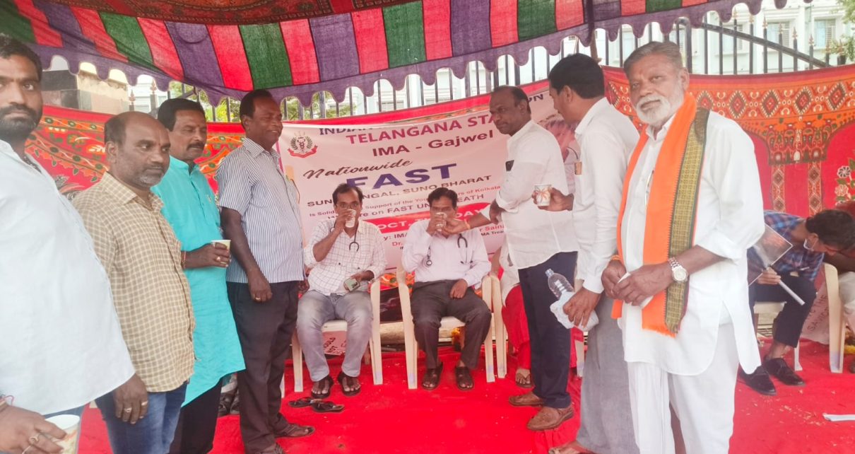 సిద్దిపేట జిల్లా గజ్వేల్ ప్రభుత్వ దవాఖాన వద్ద ఇండియన్ మెడికల్ అసోసియేషన్ గజ్వేల్ వారి ఆధ్వర్యంలో మంగళవారం ఒకరోజు నిరాహార దీక్ష నిర్వహించారు. ఈ నిరాహార దీక్షకు మద్దతు తెలిపిన బిజెపి సీనియర్ నాయకుడు దారం గురువారెడ్డి మాట్లాడుతూ పశ్చిమ బెంగాల్ లో మహిళా డాక్టర్ పై అత్యాచారం హత్య చేసిన నిందితులను వెంటనే శిక్షించాలని డిమాండ్ చేస్తూ ఐఎంఏ ఆధ్వర్యంలో ఒకరోజు నిరాహార దీక్ష చేస్తున్న డాక్టర్లకు బిజెపి ఆధ్వర్యంలో మద్దతు తెలపడం జరిగిందని అలాగే దోషులను కఠినంగా చర్చించే వరకు డాక్టర్లు చేస్తున్న పోరాటానికి మా మద్దతు ఎప్పుడూ ఉంటుందని తెలిపారు.