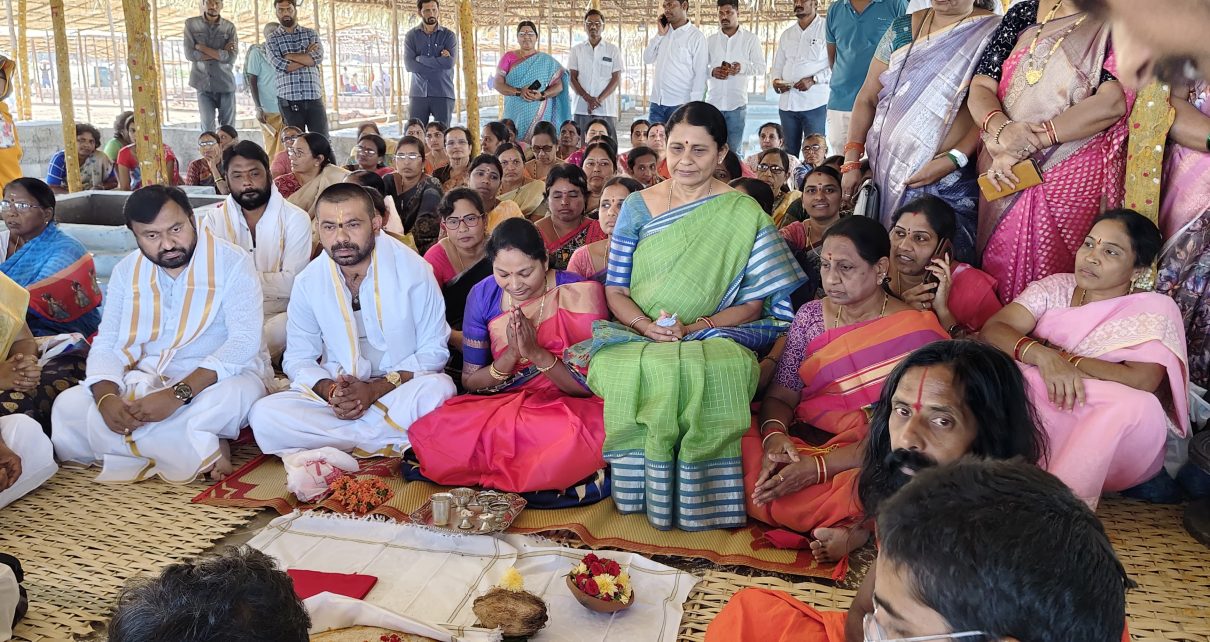 నస్పూర్ మున్సిపాలిటీ పరిధిలోని సి సి సి పోలీస్ స్టేషన్ ఎదురుగా వేదపండితుల ఆధ్వర్యంలో శ్రీ కృష్ణ కాలచక్రం శ్రీ వైష్ణవ అయుత చండి అతిరుద్రం శ్రీ సీతారామ సామ్రాజ్య పట్టాభిషేకం 86 వ విశ్వశాంతి మహాయాగ మహోత్సవంలో పాల్గొన్న మంచిర్యాల జిల్లా డీసీసీ అధ్యక్షురాలు కొక్కిరాల సురేఖ ప్రేమ్ సాగర్ రావు.