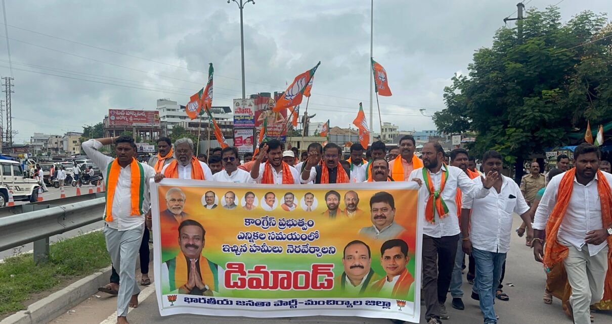 కాంగ్రెస్ పార్టీ ఎన్నికల సమయంలో ఇచ్చిన హామీలను అమలు చేయాలని, అర్హులైన పేదలకు ఇందిరమ్మ ఇళ్ల మంజూరు చేయాలని, ఎన్టీఆర్ నగర్ నీట మునిగిన ఇండ్ల వరద బాధితులకు నష్టం పరిహారం మరియు వరదతో పంట నష్టపోయిన రైతులకు నష్ట పరిహారం చెల్లించాలని డిమాండ్ చేస్తూ ఈరోజు బీజేపీ మంచిర్యాల జిల్లా అధ్యక్షులు నగునూరి వెంకటేశ్వర్ గౌడ్ ఆధ్వర్యంలో జిల్లా కలెక్టర్ కార్యాలయం ఎదుట నిర్వహించిన ధర్నా కార్యక్రమానికి ముఖ్య అతిథిగా బీజేపీ నాయకులు, మాజీ ఎంపీ బోర్లకుంట వెంకటేష్ నేత మరియు బీజేపీ రాష్ట్ర నాయకులు రఘునాథ్ వెరబెల్లి పాల్గొన్నారు. ముందుగా మంచిర్యాల ఐబీ చౌరస్తా నుండి జిల్లా కలెక్టర్ కార్యాలయం వరకు పాద యాత్రగా వెళ్ళిన అనంతరం జిల్లా కలెక్టర్ కార్యాలయం ఎదుట వరద బాధితులతో కలిసి ధర్నా చేపట్డడం జరిగింది. అనంతరం జిల్లా కలెక్టర్ ని కలిసి కాంగ్రెస్ పార్టీ ఎన్నికల సమయంలో ఇచ్చిన హామీలను నెరవేర్చాలని మరియు వరద బాధితులకు నష్ట పరిహారం అందించాలని వినతి పత్రం అందజేయడం జరిగింది.