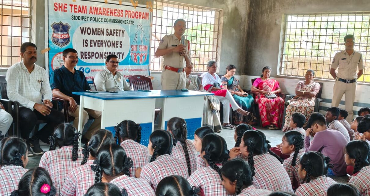 సిద్దిపేట జిల్లా వర్గల్ మండల పరిధిలోని నెంటూరు జిల్లా పరిషత్ ఉన్నత పాఠశాలలో విద్యార్థులకు మహిళల రక్షణ, షీటీమ్ వివిధ విధులు, ర్యాగింగ్, ఇవిటిజింగ్, పోక్సో, యాంటీ హ్యూమన్ ట్రాఫికింగ్, సైబర్ నేరాలు, కొత్త చట్టాలు, సోషల్ మీడియా జాగ్రత్తల గురించిన అవగాహన కార్యక్రమం నిర్వహించారు. మహిళల భద్రత కోసం ఎల్లప్పుడూ అందుబాటులో ఉంటామని, విద్యార్ధులు చెడు అలవాట్ల పట్ల అప్రమత్తంగా ఉండాలని, డ్రగ్స్, మత్తు పదార్థాల వాడకం తప్పించాలని చెప్పారు. పిల్లలపై వేధింపులైతే వెంటనే డయల్ 100 లేదా సిద్దిపేట షీటీమ్ వాట్సాప్ నెంబర్ 8712667434కి తెలియజేయాలని సూచించారు.