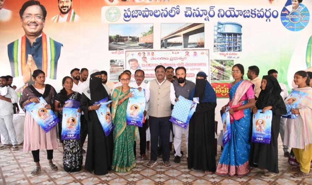 చెన్నూరు ఎమ్మెల్యే క్యాంపు కార్యాలయంలో ఇందిరా మహిళా శక్తి సంబురాల్లో భాగంగా స్వయం సహాయక సంఘాల మహిళలకు చీరలు పంపిణీ చేసిన కార్మిక మైనింగ్ శాఖ మంత్రి వివేక్ వెంకటస్వామి.