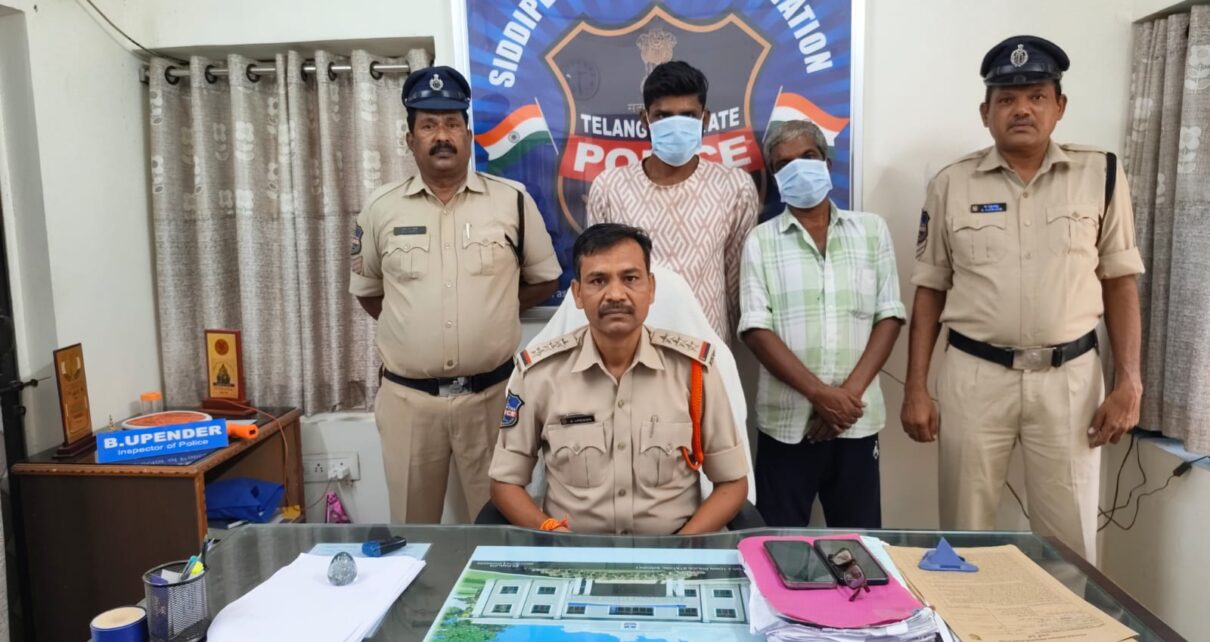 సిద్దిపేట్ మార్చి 29 రోజున రాత్రి అందాద 9.30గంటలకు కేసీఆర్ నగర్ డబుల్ బెడ్ రూమ్ నకు చెందిన బల్ల సదానందం అను వ్యక్తి డబుల్ బెడ్ రూమ్ సమీపంలోని కల్లు కాంపౌండ్ దగ్గర నుండి నడుచుకుంటూ తన ఇంటికి వెళ్తుండగా మధ్యలో ఇద్దరు గుర్తుతెలియని వ్యక్తులు కలిసి మద్యం తాగుదామని తీసుకెళ్లి ఎవరూ లేని ప్రదేశంలో తనను చేతులతో కొట్టి తన వద్దనున్న సెల్ ఫోను, 500 రూపాయలు మరియు కాలికి ఉన్న వెండి కడియం ను గుంజుకుని పోయినారని సదానందం ఫిర్యాదు మేరకు కేసు నమోదు చేసి దర్యాప్తు ప్రారంభించి ఈరోజు నిందితులు అగు అగుల్ల రాజు తండ్రి సత్తయ్య వయసు 44 సంవత్సరంలు, కులం వీరముష్టి, నివాసం డబుల్ బెడ్ రూమ్ కెసిఆర్ నగర్ మరియు సందమైన రాజు, తండ్రి రాములు వయసు 32 సంవత్సరంలు, కులం యాదవ నివాసం డబుల్ బెడ్ రూమ్ కేసీఆర్ నగర్ అను వారిని పట్టుకొని వారి వద్ద నుండి ఫిర్యాదు దారుని యొక్క సెల్ ఫోను మరియు వెండి స్వాధీన పరుచుకుని నిందితులను రిమాండు కు తరలించడం అయినది అని సిద్దిపేట టూ టౌన్ పోలీస్ స్టేషన్ ఇన్స్పెక్టర్ బి.ఉపేందర్ తెలియపరచడమైనది..