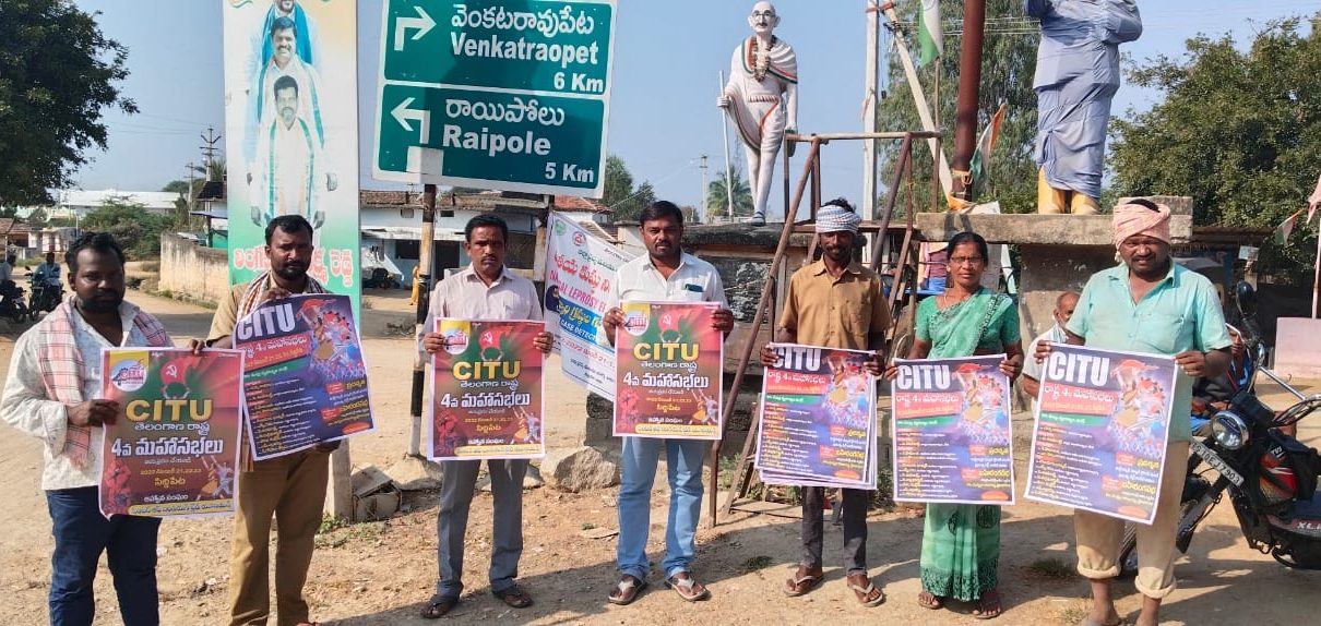 డిసెంబర్ 21 నుండి 23 వరకు జరిగే సిఐటియు తెలంగాణ రాష్ట్ర మహాసభలు జయప్రదం చేయాలని జిల్లా అధ్యక్షులు సందబోయిన ఎల్లయ్య పిలుపునిచ్చారు. రాయపోలు మండలం అనాజపురం గ్రామంలో రాష్ట్ర మహాసభల పోస్టర్ను ఆవిష్కరించడం జరిగింది. ఈ సందర్భంగా ఆయన మాట్లాడుతూ సిఐటియు రాష్ట్ర మహాసభలు మొదటిసారిగా సిద్దిపేట పట్టణంలో నిర్వహించడం జరుగుతుందని ఈ మహాసభలు విజయవంతం చేయాలని పిలుపునిచ్చారు. మహాసభలకు జాతీయ అధ్యక్ష ప్రధాన కార్యదర్శులు, కేరళ కార్మిక శాఖ మంత్రి శివం కుట్టి తెలంగాణ రాష్ట్ర నాయకత్వం అన్ని జిల్లాల నుండి ప్రతినిధులు హాజరవుతున్నారని తెలిపారు. కార్మిక సమస్యలు చర్చించి రాబోయే కాలానికి ప్రణాళికా ఈ మహాసభల్లో రూపొందించడం జరుగుతుందని అని తెలిపారు. కేంద్రంలోని బిజెపి ప్రభుత్వం కార్మిక చట్టాలన్నింటిని రద్దు చేయడం జరిగిందని నూతనంగా కార్మిక కోడెల రూపొందించారని దీనితో కార్మికులకు నష్టదాయకం ఏర్పడుతుందని కార్పొరేట్ యజమానులకు అనుకూలంగా ఉన్నాయని అన్నారు. గ్రామపంచాయతీ అంగన్వాడీ ఆశా మధ్యాహ్న భోజనం ఉపాధి హామీ ఫీల్డ్ అసిస్టెంట్లు మున్సిపల్ కాంట్రాక్ట్ కార్మికులు అన్ని తరగతుల ఉద్యోగులు సమస్యలు ఎదుర్కొంటున్నారని హమాలీ, ఆటో ట్రాన్స్పోర్ట్, భవన నిర్మాణం, బీడీ తదితరంగాల కార్మికులకు వెల్ఫేర్ బోర్డు ఏర్పాటు చేయాలని సంక్షేమ పథకాలు అమలు చేయాలని తదితర సమస్యల పరిష్కారం కోసం మహాసభల్లో చర్చించి భవిష్యత్ కార్యాచరణ రూపొందిస్తామని అన్నారు. ఈ కార్యక్రమంలో సిఐటియు జిల్లా కమిటీ సభ్యులు రంగారెడ్డి గ్రామపంచాయతీ యూనియన్ నాయకులు మల్లేశం, బాలమణి, సైదులు, నర్సింహులు తదితరులు పాల్గొన్నారు.